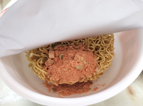 4分経ったので、残りのかやくスープと液体スープを入れてみます。