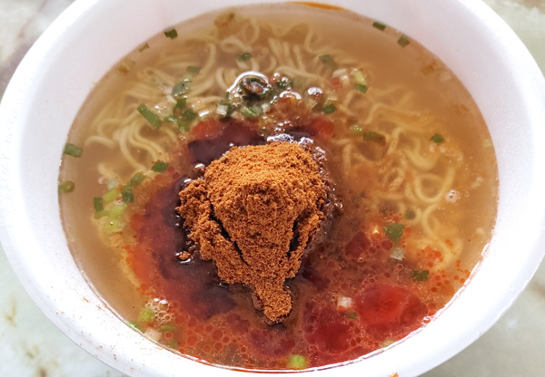 それでは、中身を開けてみると、袋が3袋ありましたが、作り方が記載されてなかったので、粉末スープとお湯を先に入れてみることに。