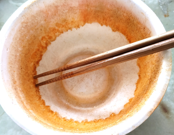 終わった後には、辛さの余韻を知るかのように、カップに魚粉と唐辛子が付いてました。