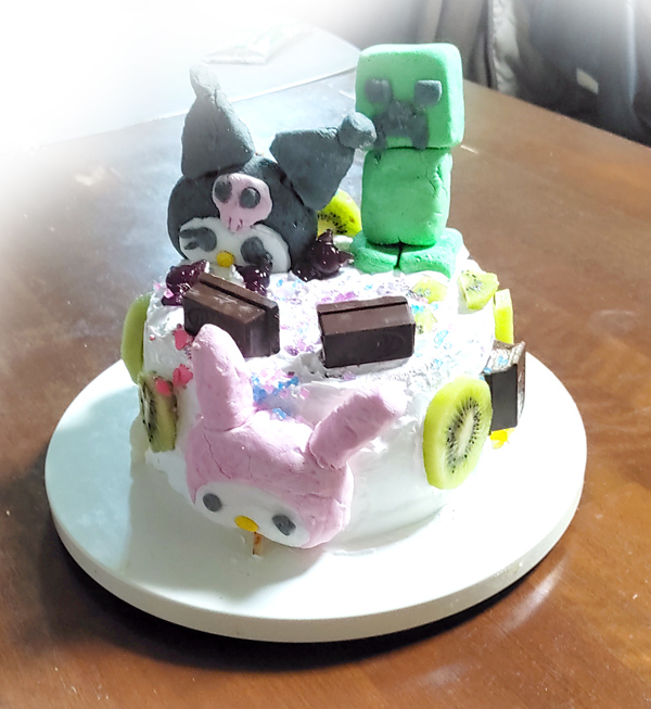 キウイの薄切りやダイソーで買ったパウダーとか、キットカットとか使って、こんな感じのケーキになりました。